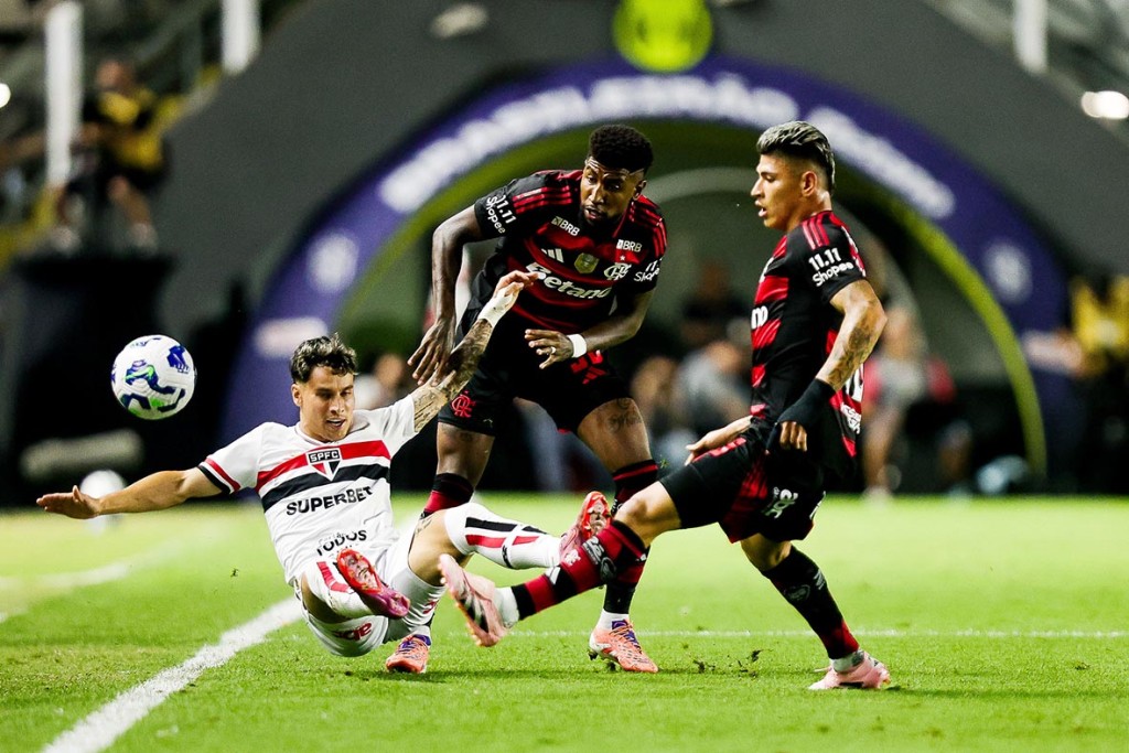 São Paulo e Flamengo protagonizaram um clássico eletrizante que terminou em empate por 2 a 2, na noite desta quarta-feira, na Vila Belmiro. A partida, válida pela 32ª rodada do Campeonato Brasileiro, foi marcada por reviravoltas, gols e uma expulsão que mudou os rumos do confronto. Luciano e Ferreirinha garantiram os tentos tricolores, enquanto Arrascaeta, de pênalti, e Samuel Lino balançaram as redes para o Rubro-Negro, que amargou a expulsão de Plata no segundo tempo, quando já havia virado o placar.