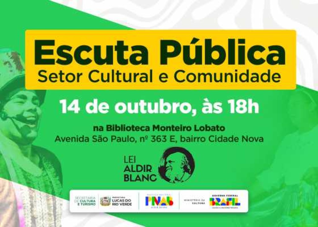 A Secretaria de Cultura e Turismo de Lucas do Rio Verde convida a população e representantes do setor cultural para participar de uma Escuta Pública, que ocorrerá no dia 14 de outubro de 2024, às 18h, na Biblioteca Monteiro Lobato. O encontro tem como objetivo discutir a Lei Aldir Blanc, suas implicações e como otimizar sua aplicação para fortalecer o setor cultural na comunidade.