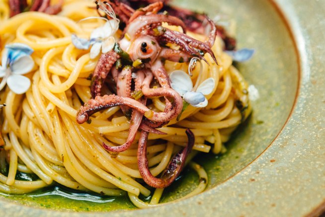 Espaguete ao curry de laranja com lulas