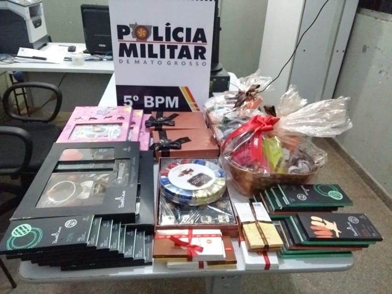 Ao ser verificado o saco que os suspeitos carregavam foram encontrados diversos tabletes, cestas e embalagens de chocolate, todos com a logomarca Cacau Show.